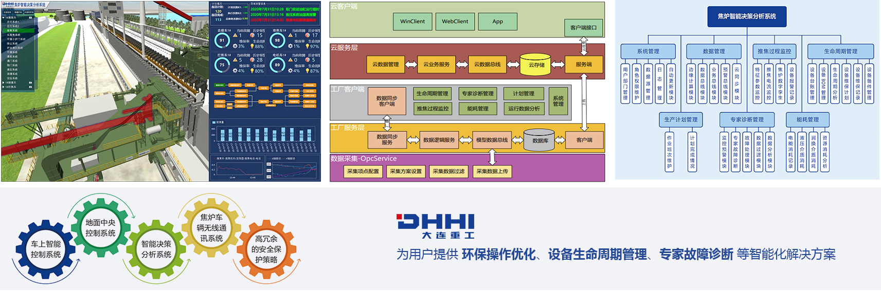 系统由车上智能控制系统、地面中央控制系统、智能决策分析系统、焦炉车辆无线通讯系统、高冗余的安全保护策略等五大核心组成。