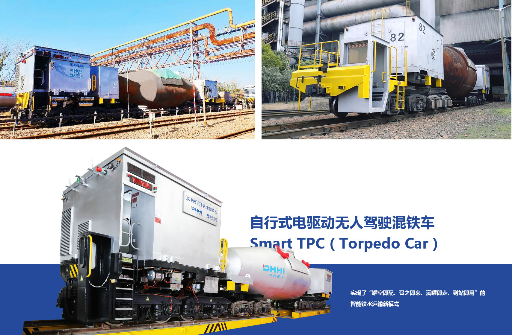 自行式电驱动无人驾驶混铁车Smart TPC(Torpedo Car)是一种绿色、智能、高效的铁水运输设备,采用自动驾驶,纯电力驱动,实现了“罐空即配、召之即来、满罐即走、到站即用”的智能铁水运输新模式,可智能、绿色、高效地完成从高炉到炼钢的铁水运输作业。