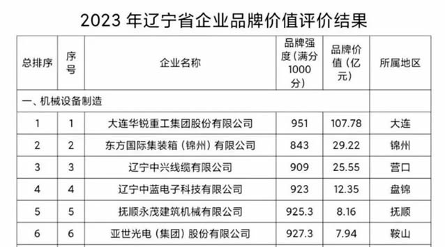 近日,辽宁省品牌建设促进会联合辽宁广播电视台发布了2023年度辽宁省品牌价值评价信息,评价结果显示,征途国际重工以951分(满分1000分)的品牌强度、107.78亿元的品牌价值,位居机械设备制造企业榜第一位。